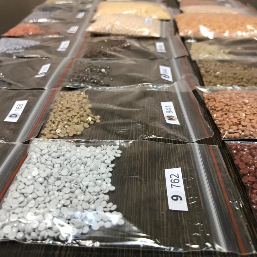 - 5. Возьмите пакет с нужными стразами и насыпьте небольшое количество в поддон. Берите стразы нужного цвета карандашом и выкладывайте на холст, придавливая. Символ на схеме соответствует цвету страз в пакетике с таким же символом. При выкладке края стразы должны четко закрывать условное обозначение на схеме. При необходимости аккуратно отклейте стразу и приклейте заново. Не допускайте наслаивания страз.
